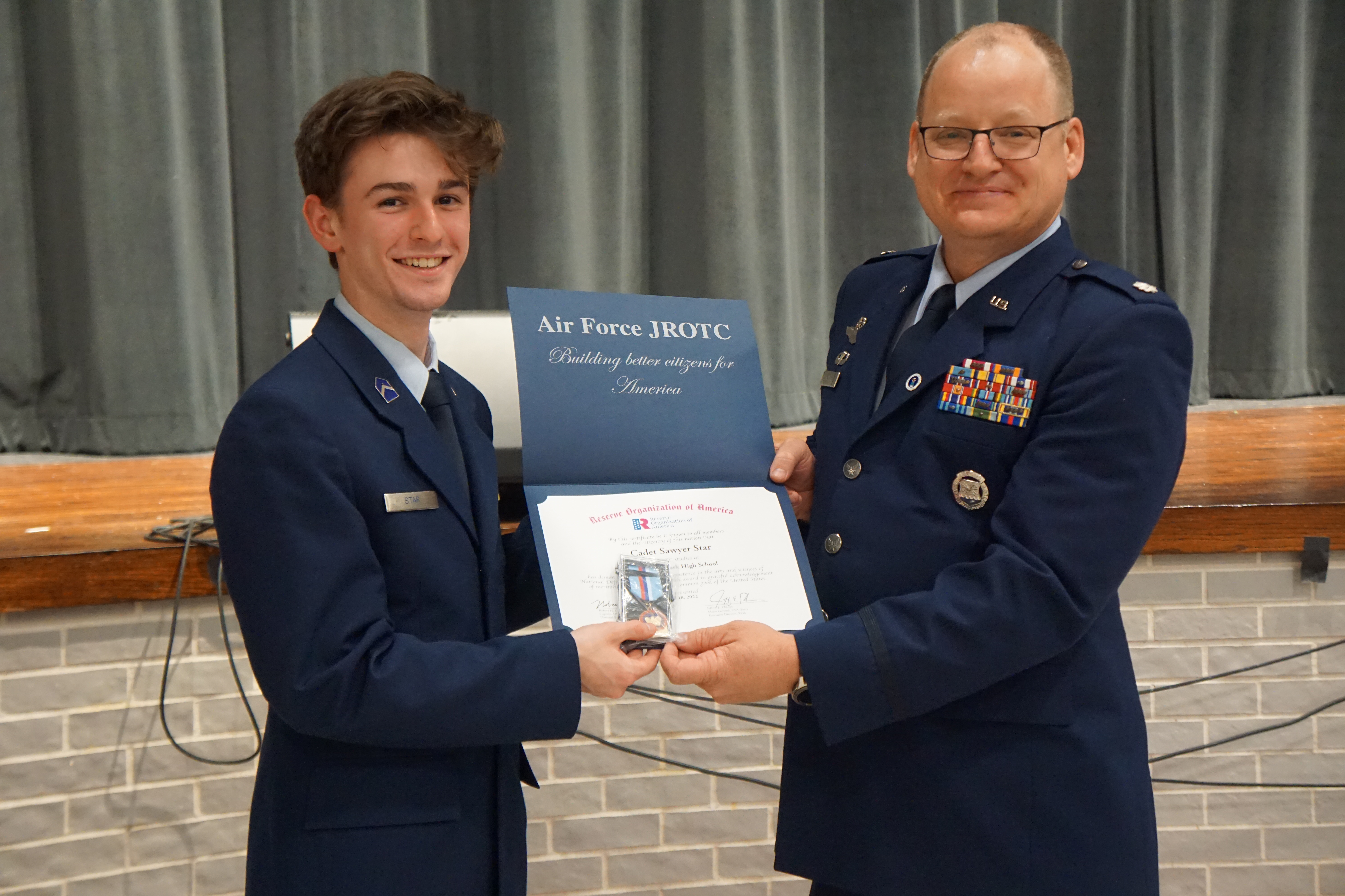 Cadet Major Sawyer Star receives ROA ROTC award for service at Kingwood Park High School in Kingwood, Texas by Senior Aerospace Science instructor, Lt. Col. T. Donavan Kanak on April 18, 2022.