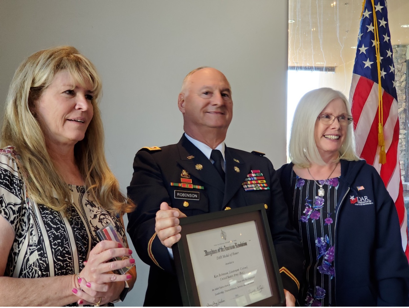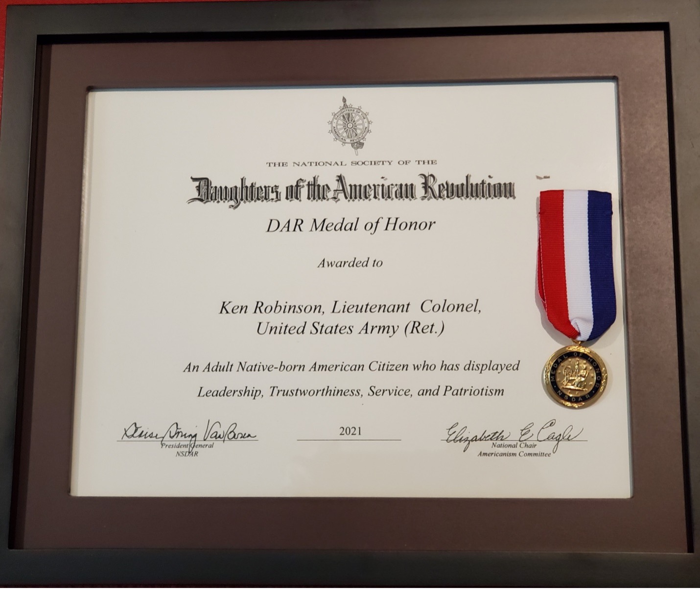 In recognition of outstanding service, leadership, and patriotism to his country, the Daughters of the American Revolution presented retired U.S. Army Lt. Col. Ken Robinson, with the National Society Daughters of the American Revolution Medal of Honor on Nov. 11, 2021.