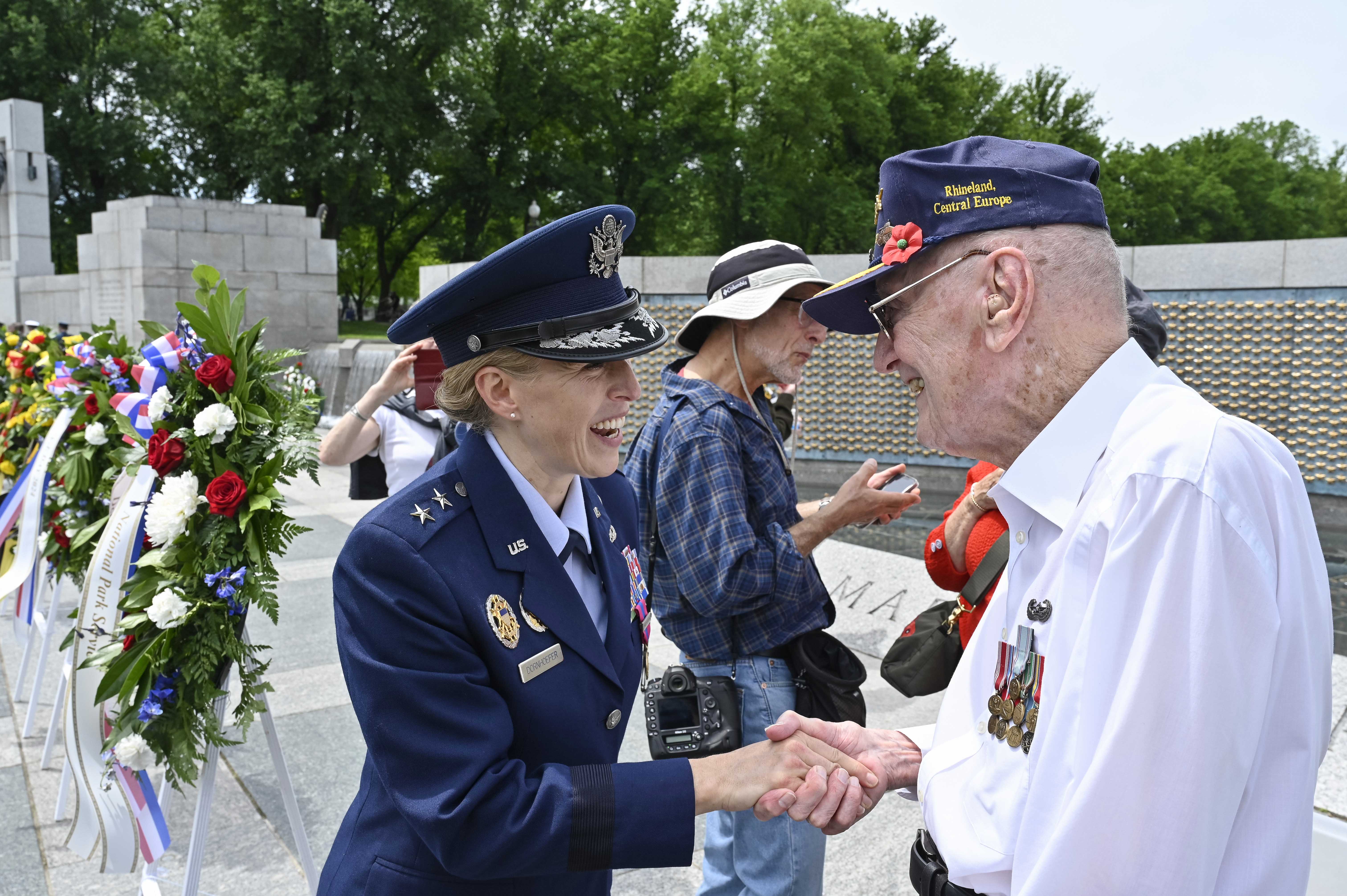 ROA member Air Force Maj. Gen. Vanessa Dornhoefer greets a World War II veteran during a V-E Day ceremony at the World War II Memorial in Washington, D.C., May 8, 2024.