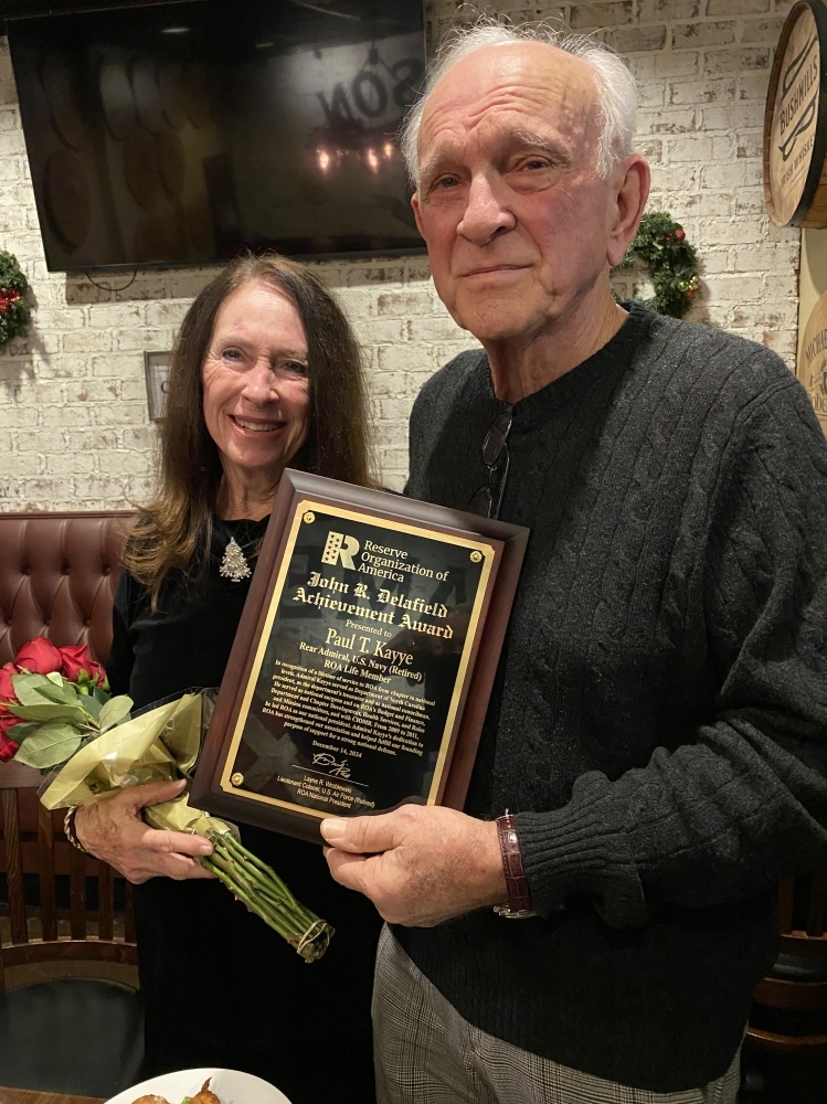 Photo caption: Rear Adm. Paul T. Kayye (above right) and his wife Linda “Gay” Kayye display the John R. Delafield Achievement Award, received by Kayye for his support for ROA. Congratulations on this well deserved award.