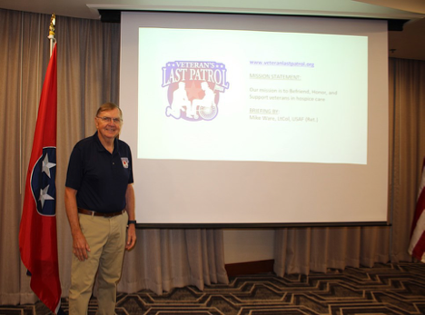 The meeting featured several guest speakers from various military and veteran organizations: Mike Ware represented Veteran’s Last Patrol, shared insights on their mission to befriend, honor, and support veterans receiving hospice care.