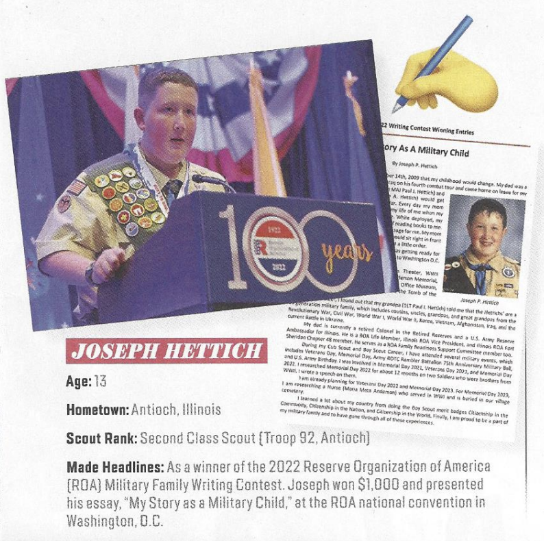Joseph was featured in “Scout Life” for making headlines as a winner of the 2022 Reserve Organization of America Military Family Writing Contest. He was awarded a certificate and check for $1,000 on Saturday, October 1, 2022 at the Crystal City Marriott at Reagan National Airport, Washington, D.C.