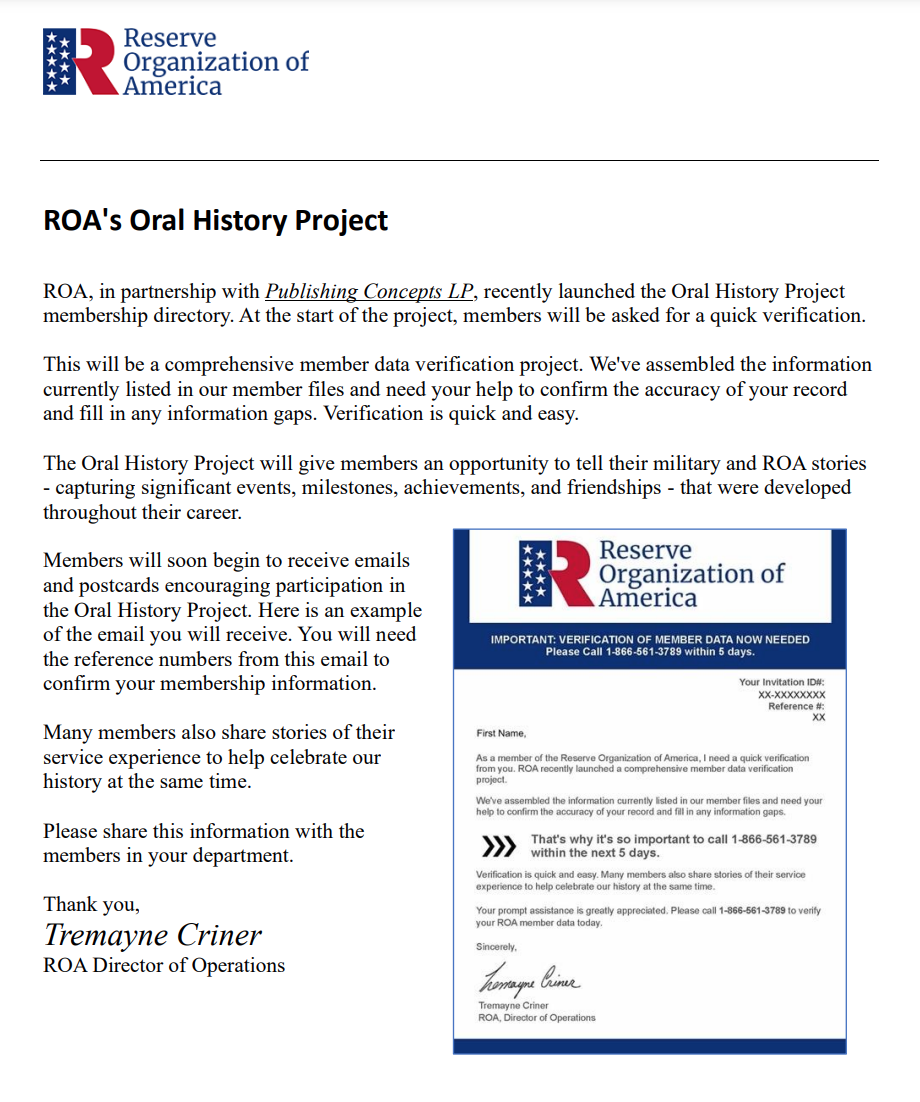 The Oral History Project will give members an opportunity to tell their military and ROA stories – capturing significant events, milestones, achievements, and friendships – that were developed throughout their career.